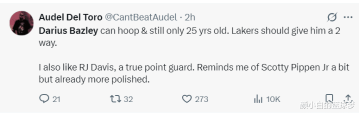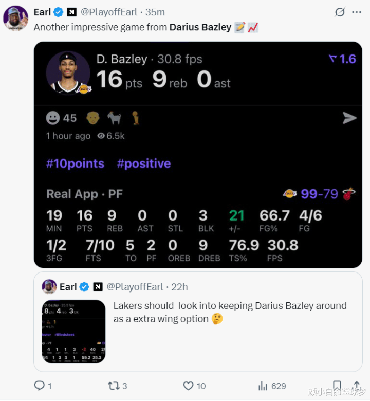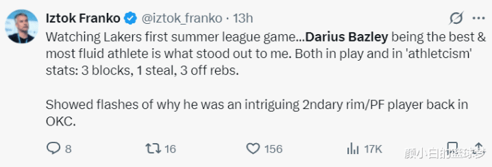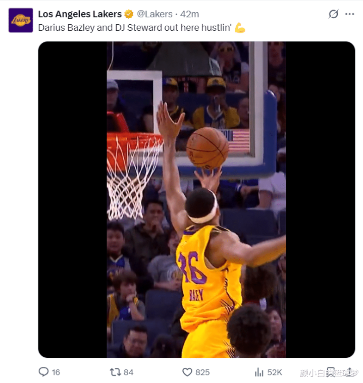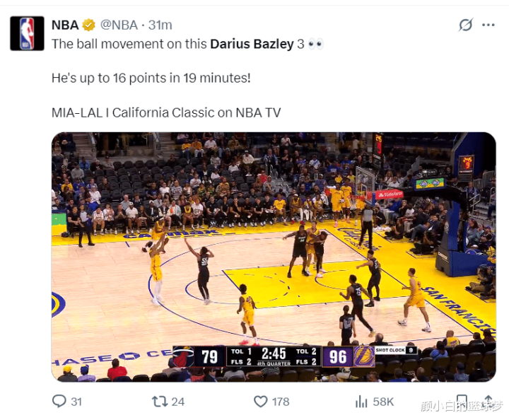 NBA官方还晒出贝兹利小节掷中三分球的瞬息,写谈贝兹利短短19分钟就拿到16分。