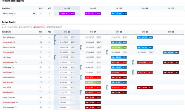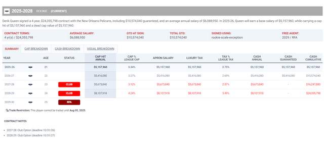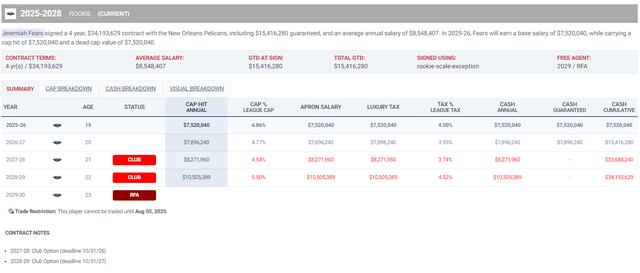 费尔斯与鹈鹕签下的是一份四年3419万的协议,下赛季752万,26-27赛季789万、27-28赛季827万(球队选项)、28-29赛季1050万(球队选项)。