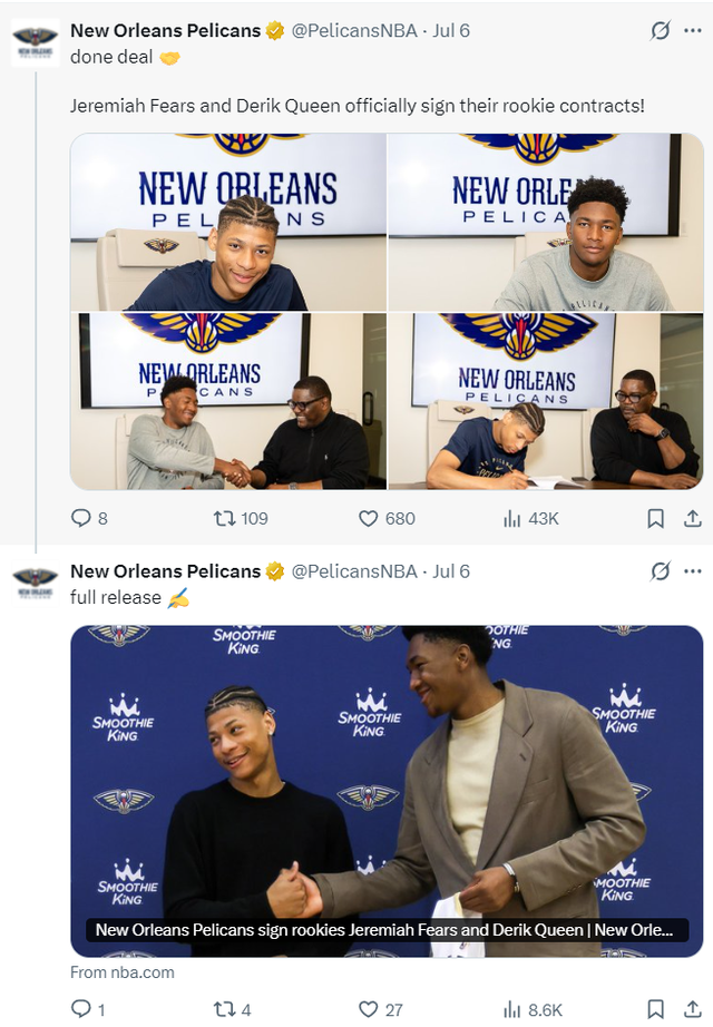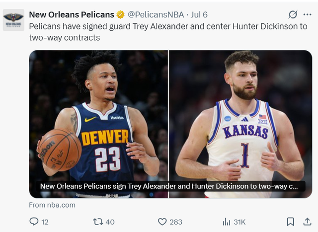 鹈鹕还用双向协议区别 签下了特雷-亚历山大与亨特-迪金森两东谈主,如斯一来鹈鹕队的三位双向协议球员也仍是敲定了。